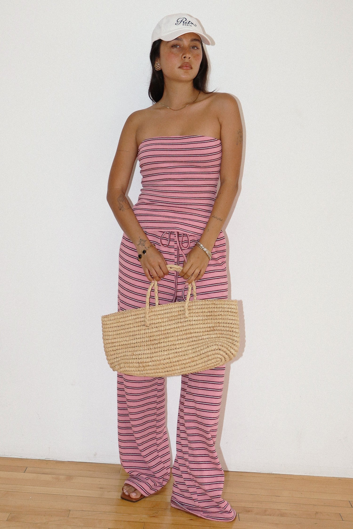 Ultra chic and ultra comfortable! Tube top with side slit in suite stripe pattern.