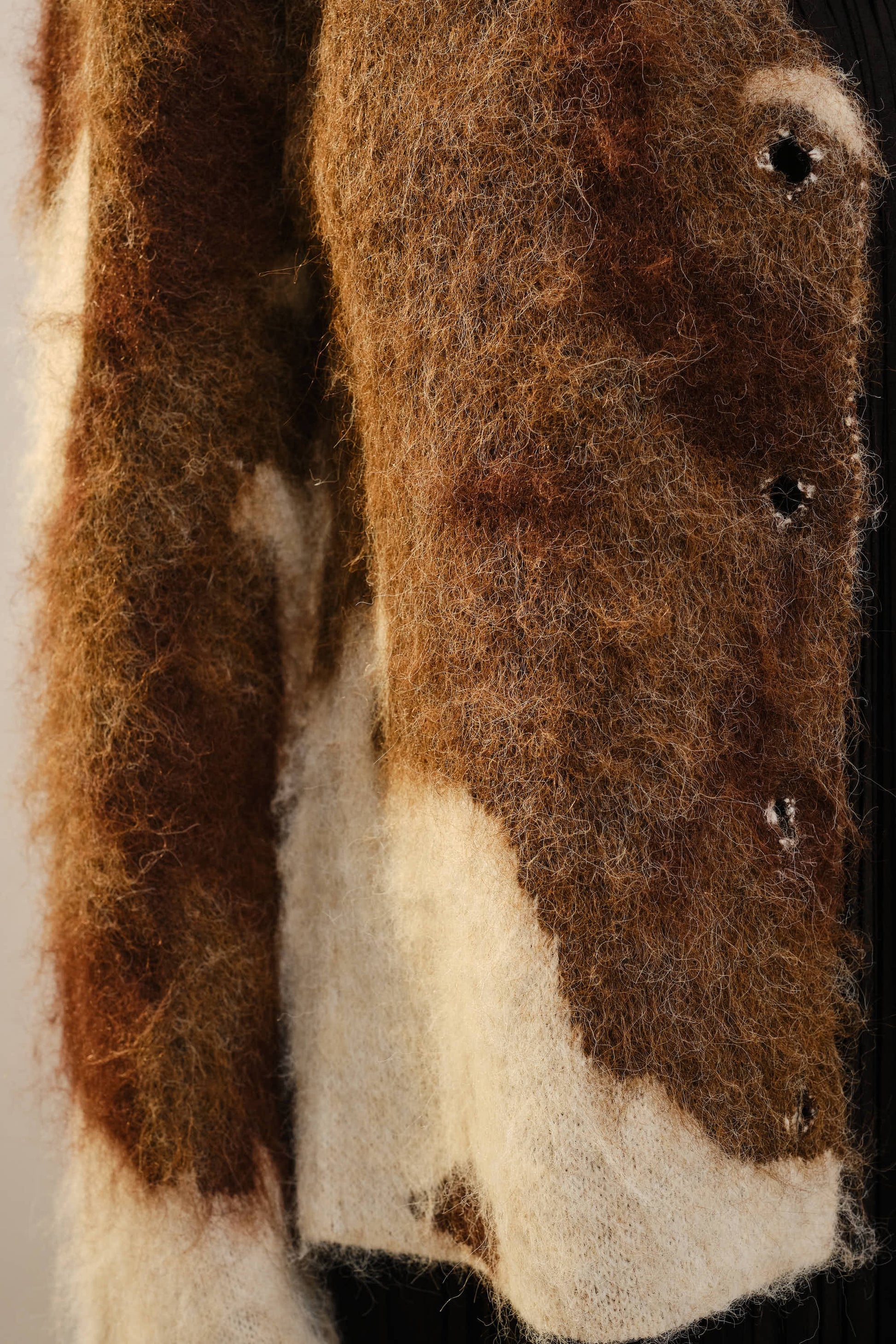A cozy statement jacket featuring a bold cow pattern in earthy tones. Designed with a relaxed fit, soft brushed texture, and large button closures for a touch of vintage flair. Perfect for layering over dresses or denim for a chic Western-inspired look.