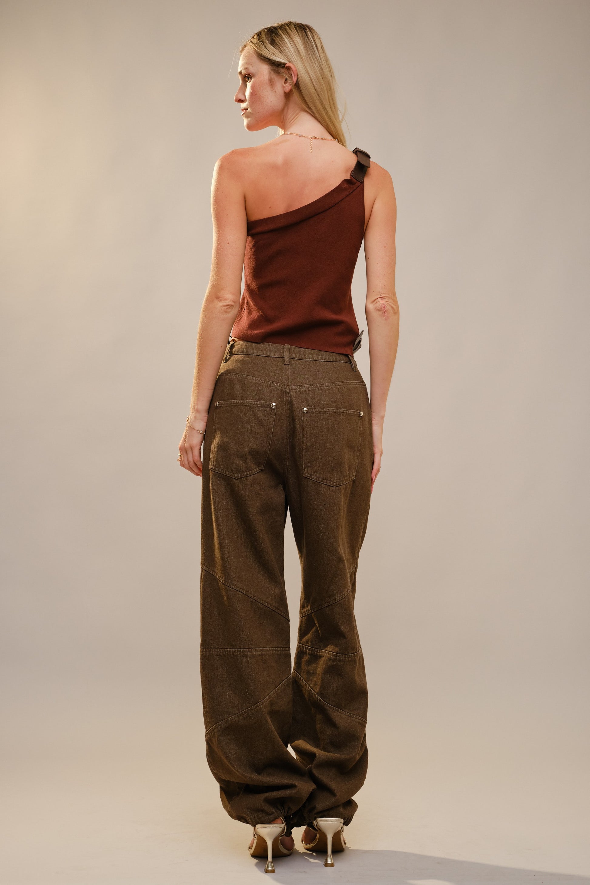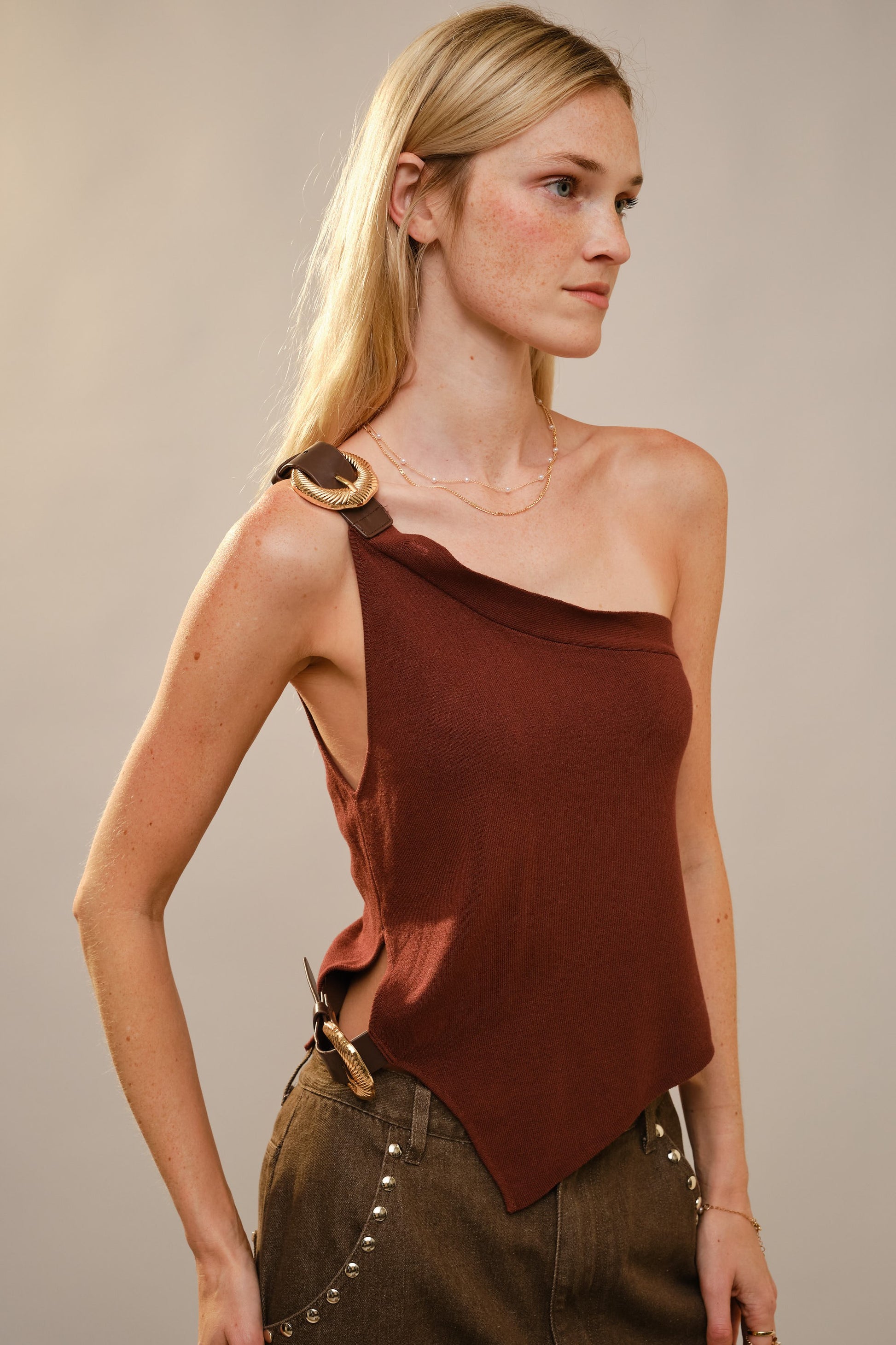 One-shoulder knit top with asymmetrical neckline and angled hem, finished with bold gold-tone buckle details at the shoulder and waist.