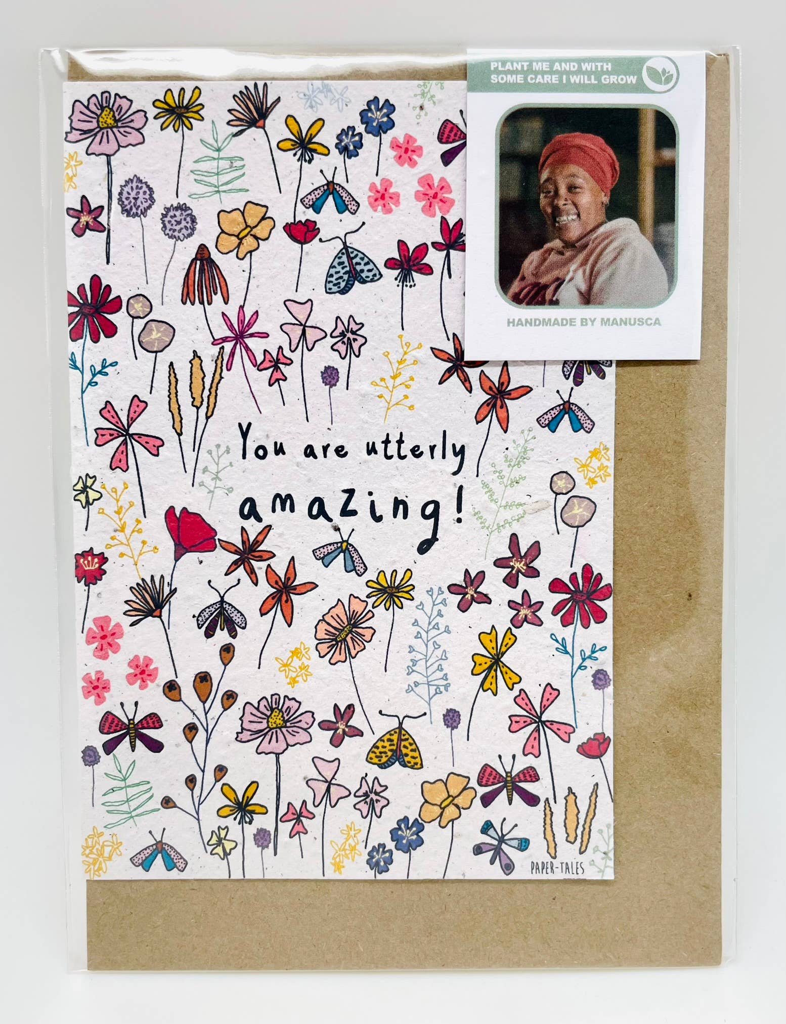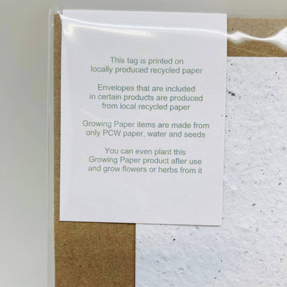 Greeting cards made in South Africa with recycled paper and seeds, giving the recipient the option to plant the card and grow flowers such as snapdragon and alyssum. All cards are blank inside and sold individually. The name and photo of the artisan who created the card will be shown on the insert or sticker, depending on packaging chosen.