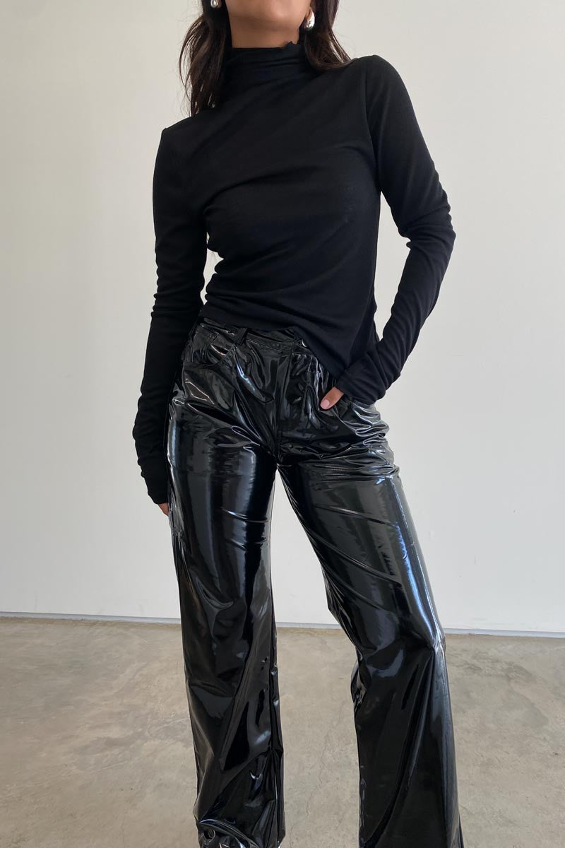 Soft ribbed long sleeve top with high neck and semi-sheer design.