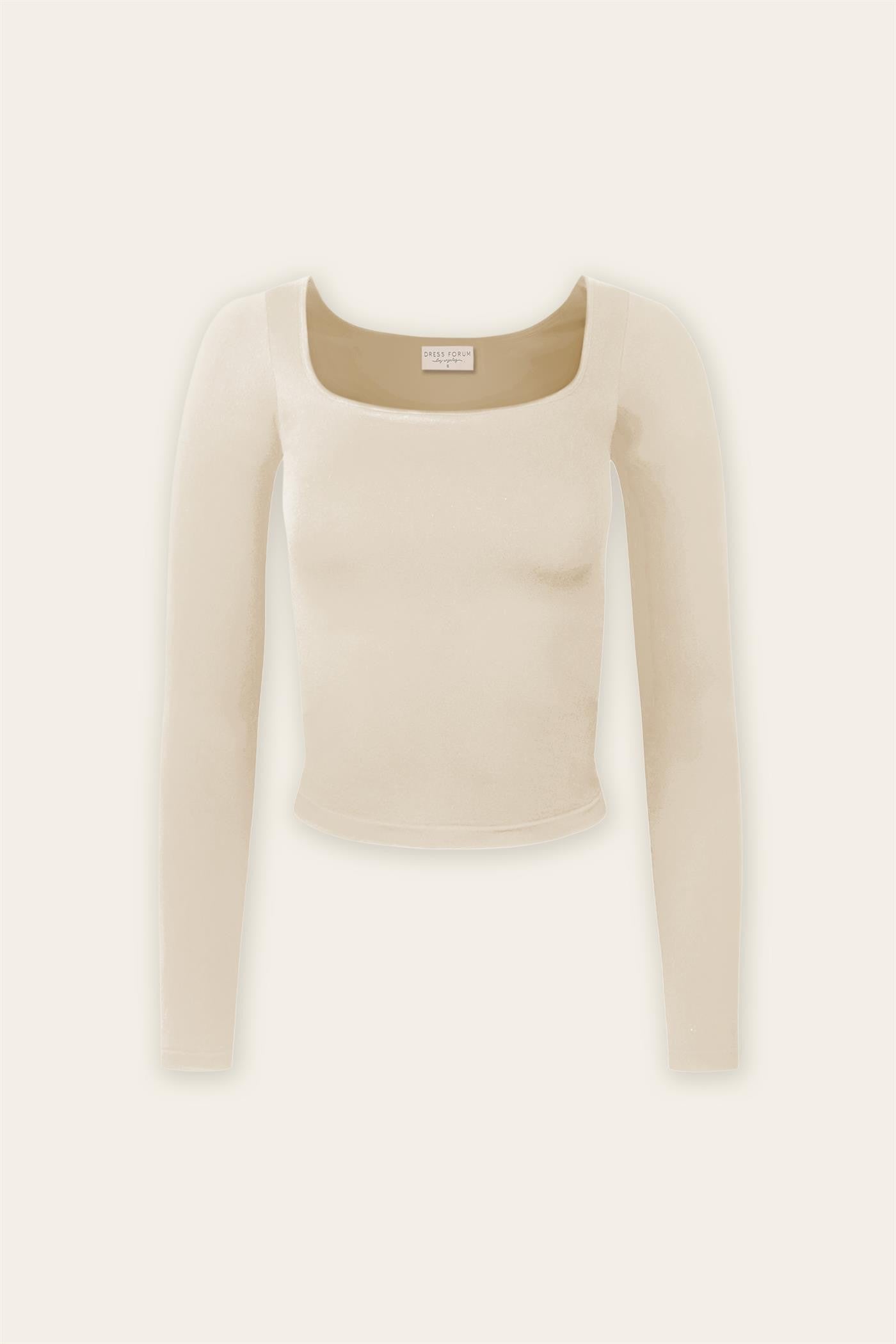 Long sleeve top with square neckline and hits right at the top of the hips.