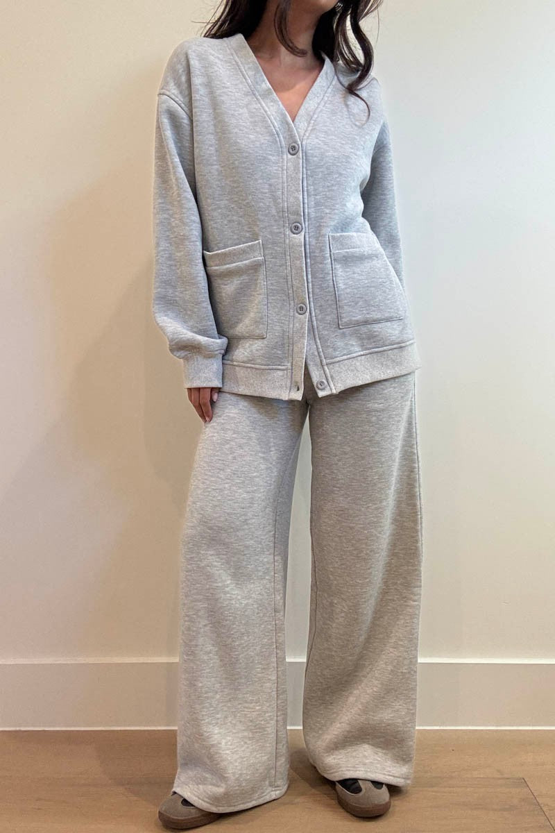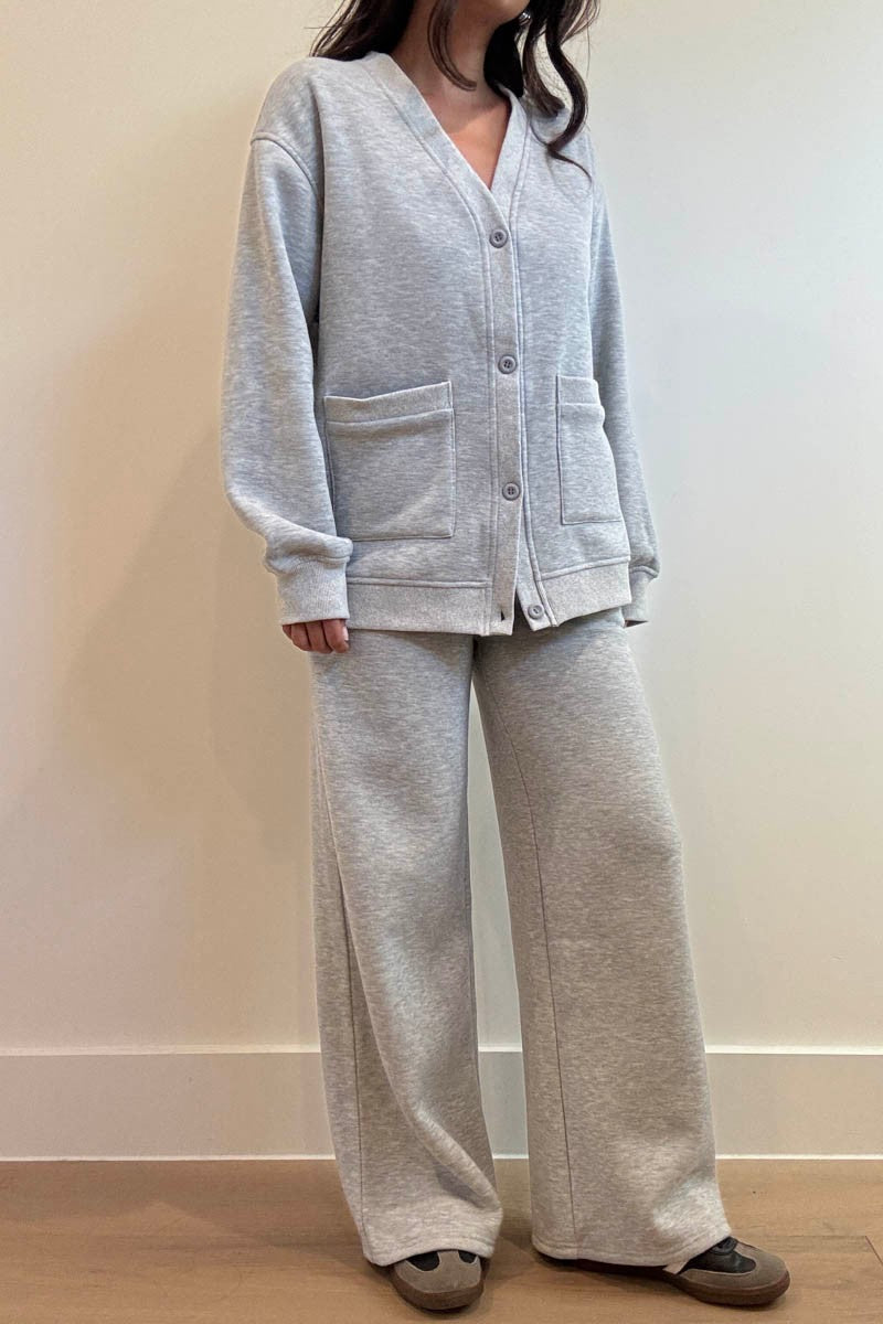 The relaxed-fit cardigan features an oversized silhouette with a functional button front. Paired with matching wide-leg sweatpants complete with an adjustable drawstring waist and side pockets, this set combines loungewear ease with elevated style.