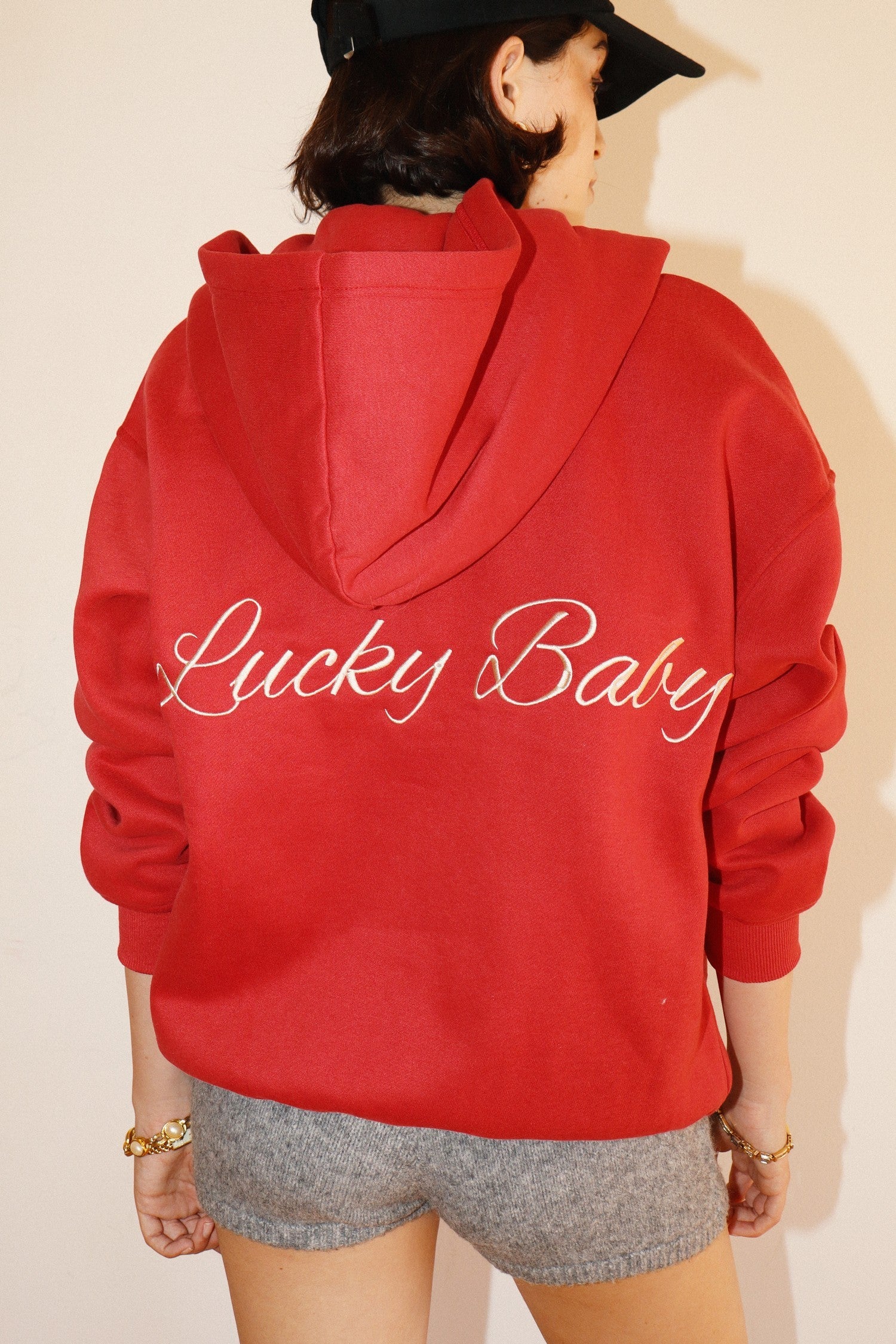 Zip-up hoodie with an embroidered horse shoe and "lucky baby" script.