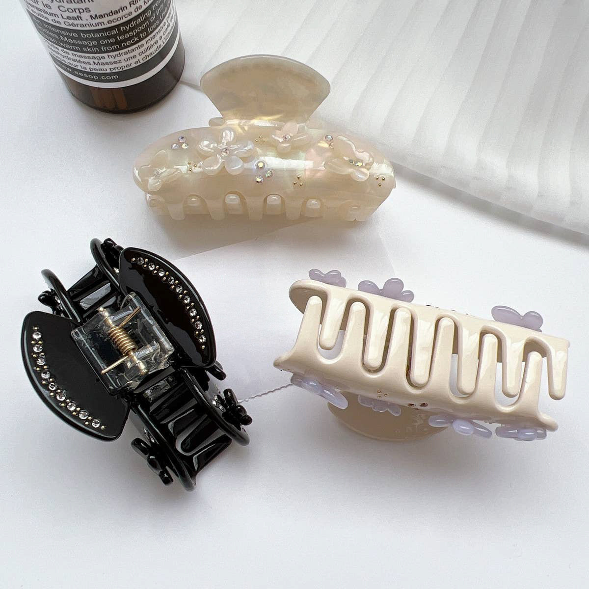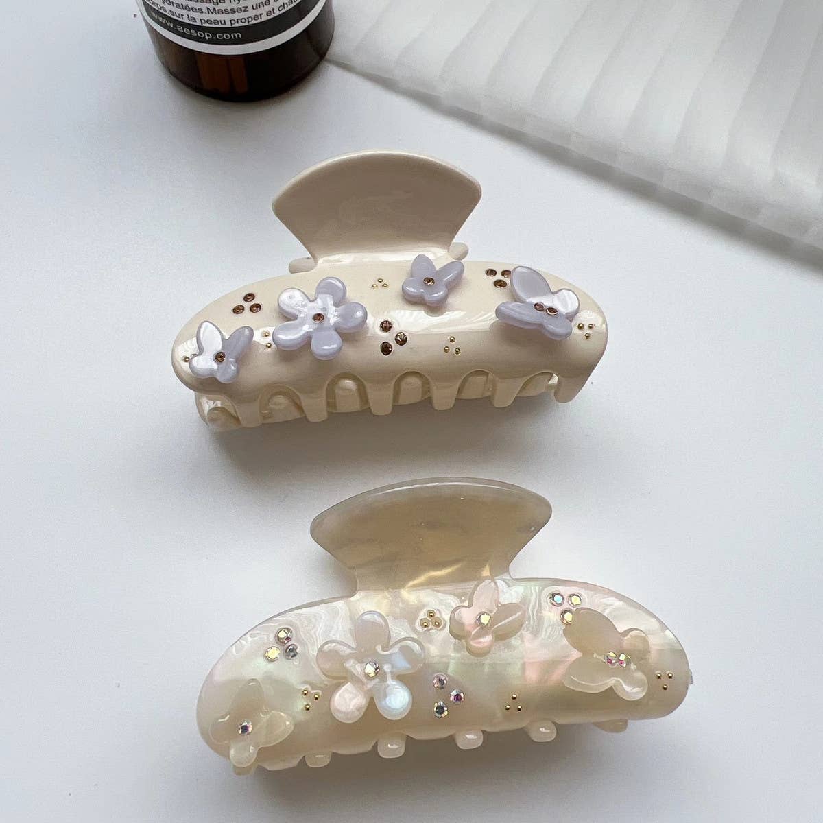Hair clip embellished with rhinestones and adorned with 3D butterfly and flower motifs.