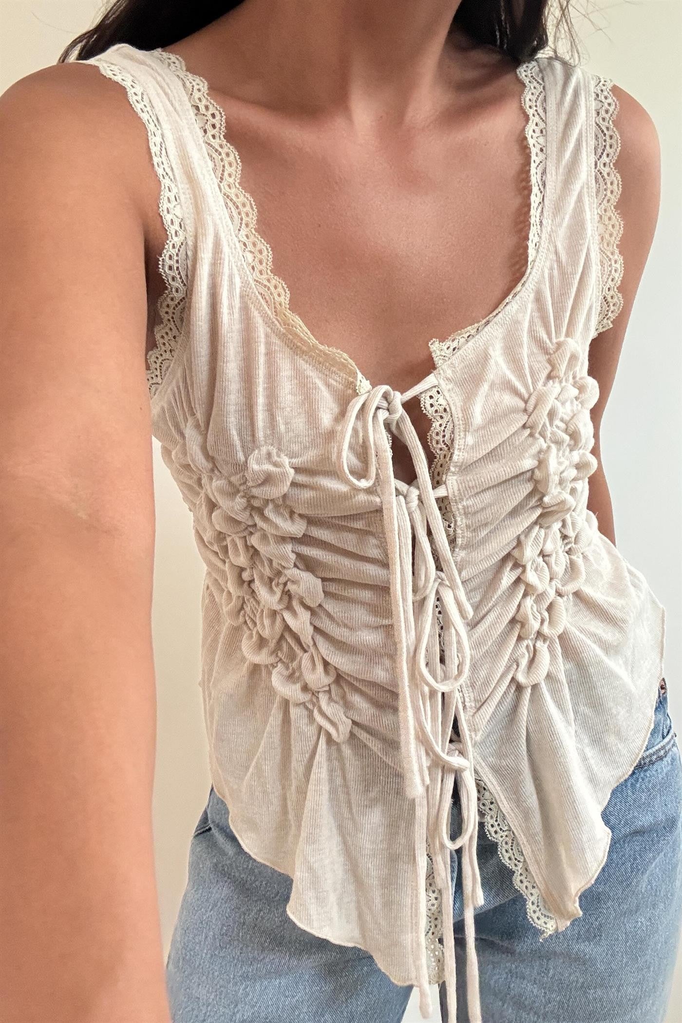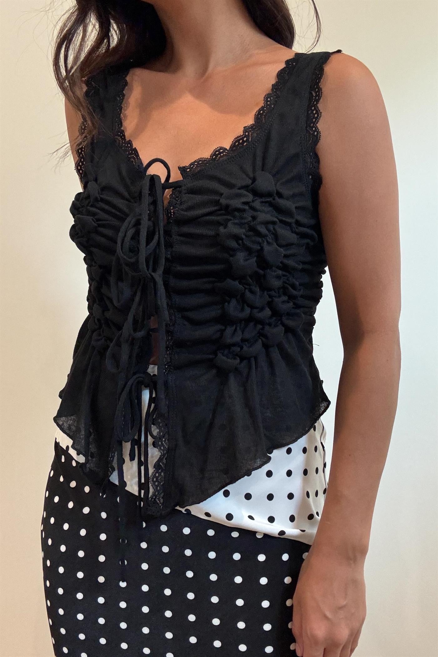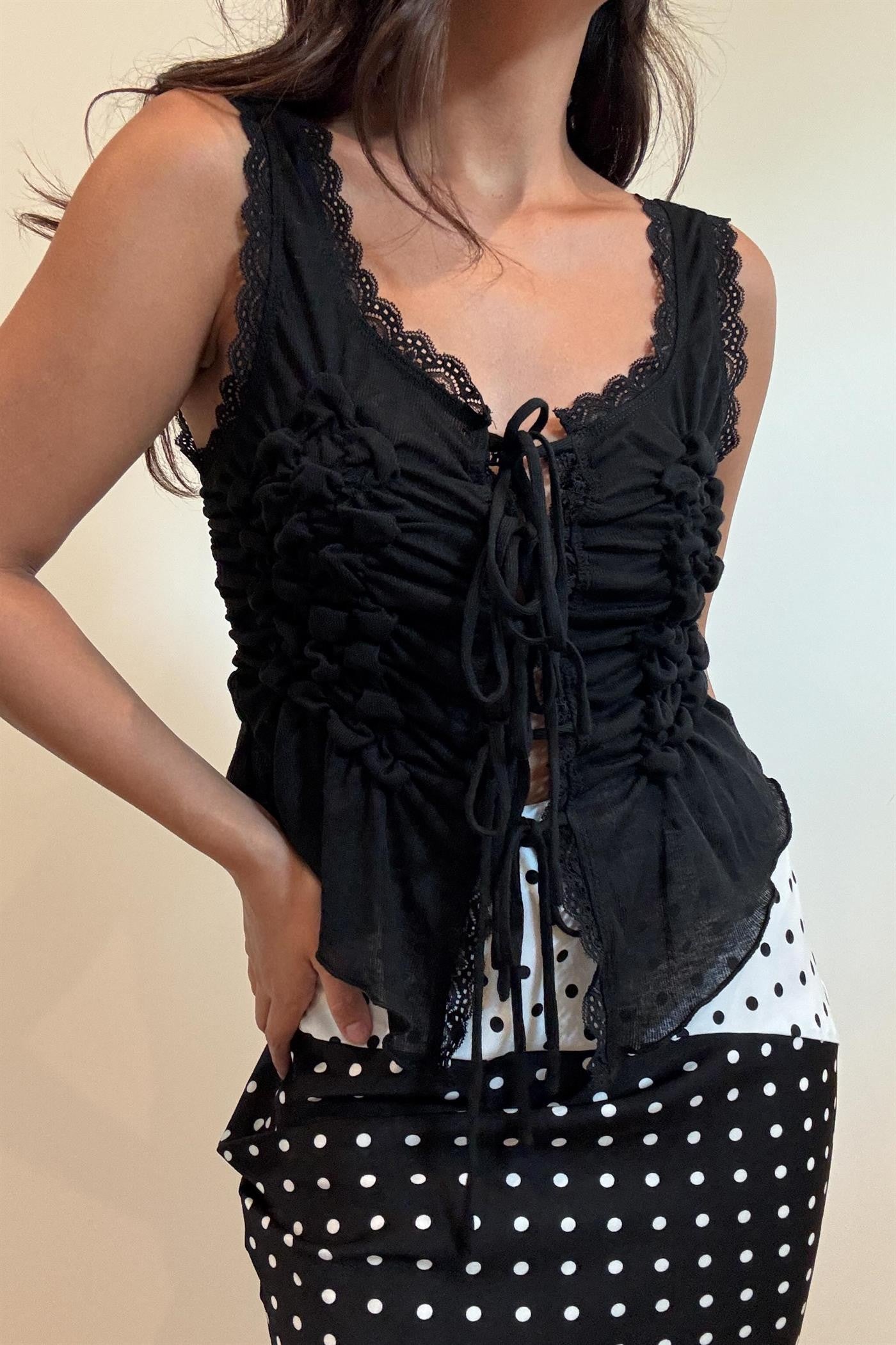This top offers a soft, breathable feel that drapes beautifully on the body. The intricate lace detailing adds a touch of elegance, making it ideal for both casual outings and more formal occasions. The front tie feature not only enhances your silhouette but also allows for adjustable styling, while the ruched design provides a flattering fit that accentuates your curves.